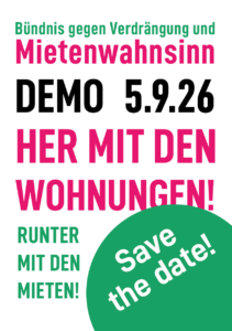 - Eine große Mieten-Demo vor der Wahl 2026 (Vorschlag: „Wir finden keine Wohnung!“ am 05. September)