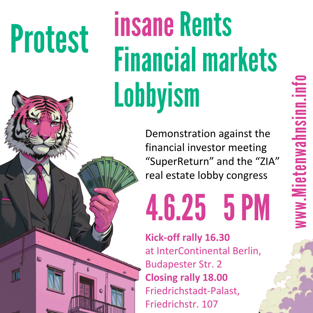 To give the rich even more opportunity to extract wealth from our city, the “Tag der Immobilienwirtschaft” (Real Estate Industry Day) will take place on June 4 at the Friedrichstadt-Palast to coincide with the “SuperReturn”. This is Germany’s largest lobby meeting for the real estate sector, organized by its largest lobby association, the ZIA (German Central Real Estate Committee). This is where the profiteers of the housing shortage network with political and administrative leaders. This is where the framework is set to exploit us tenants even more effectively. This is where the Mietenwannsinn is produced. It is one of the places of economic violence and political contempt towards the majority of the population – towards us tenants.