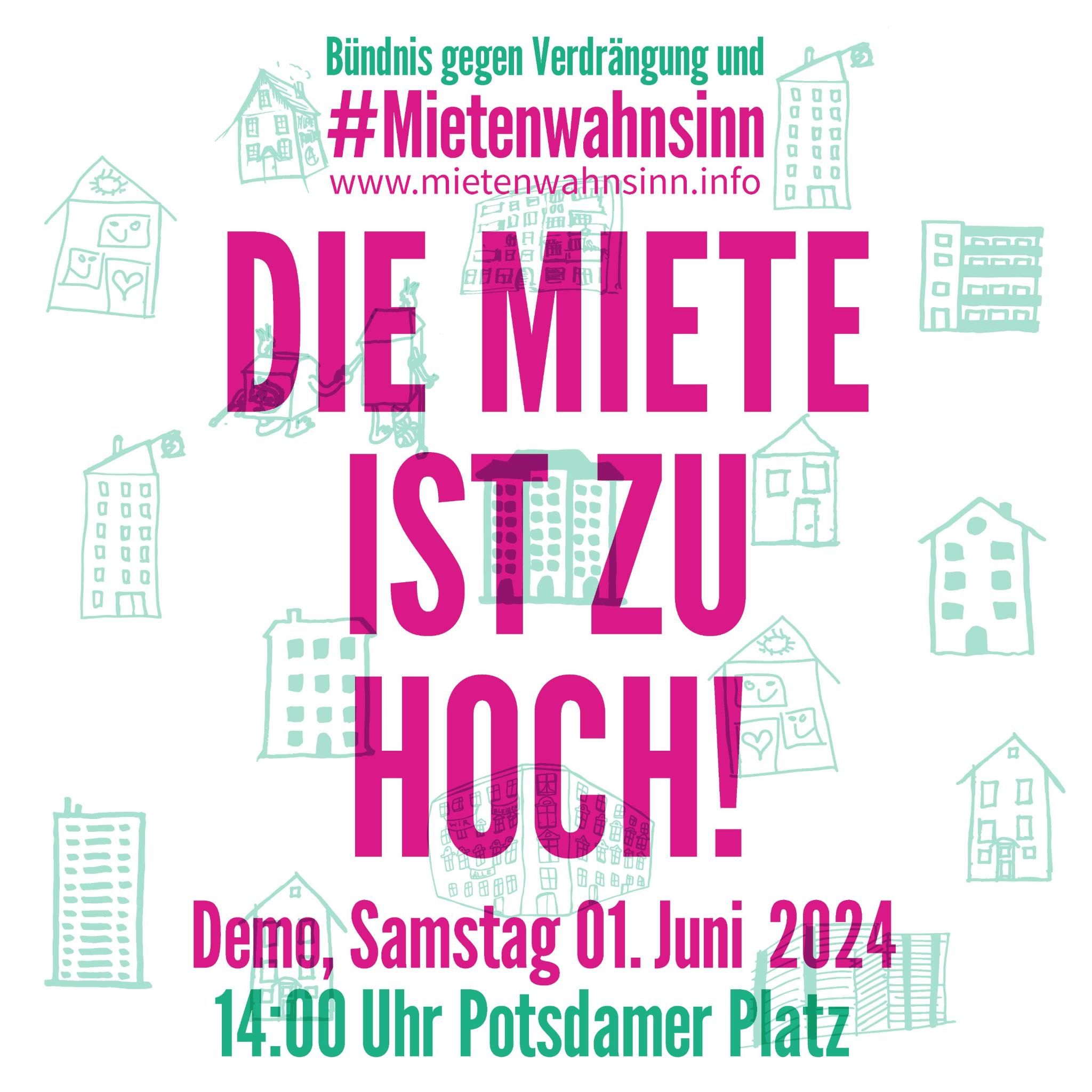 Am Samstag, den 1. Juni wollen wir gemeinsam unseren Protest auf der Straße zeigen. Wir wollen kurz vor der Europawahl deutlich machen, dass eine soziale Politik das beste Mittel gegen den Rechtsrutsch ist. Und wir wollen vor dem „Tag der Immobilienwirtschaft“ (der größten Lobbyveranstaltung der Immobilienbranche, die am 11. Juni 2024 im Tempodrom stattfindet) ein starkes Zeichen setzen: