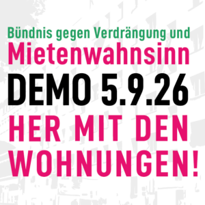 Wohnungen für Alle statt Millionen für Wenige. Wir sind die 85 % – die Mieterinnen und Wohnungslosen Berlins! Raus auf die Straße, komm kurz vor der Berlin-Wahl zur Demo gegen die Wohnungskrise: