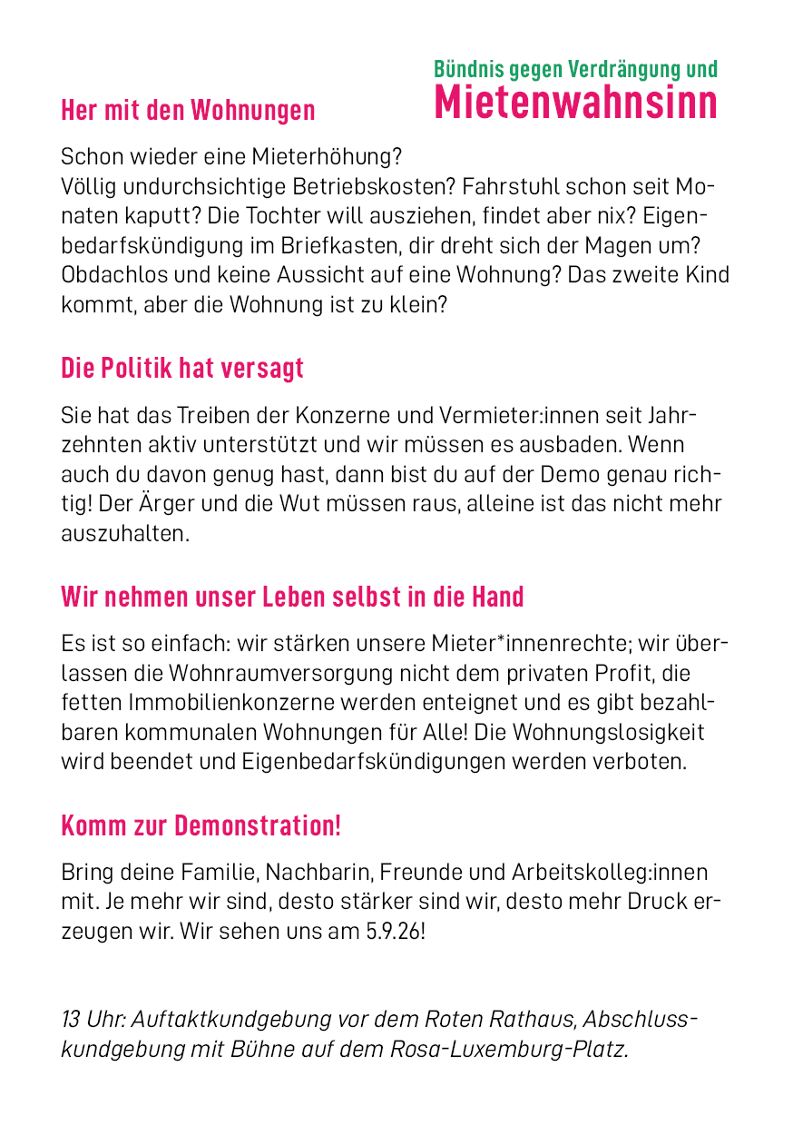 Komm zur Demonstration! Bring deine Familie, Nachbar:in, Freunde und Arbeitskolleg:innen mit. Je mehr wir sind, desto stärker sind wir, desto mehr Druck erzeugen wir. Wir sehen uns am 05.09., vor dem Roten Rathaus, Berlin-Mitte!