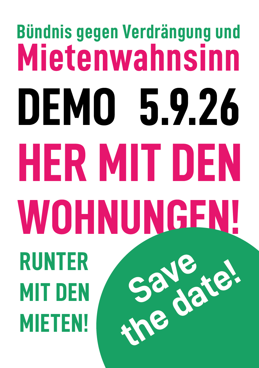 Wohnungen für Alle statt Millionen für Wenige. Wir sind die 85 % – die Mieterinnen und Wohnungslosen Berlins! Raus auf die Straße, komm kurz vor der Berlin-Wahl zur Demo gegen die Wohnungskrise: