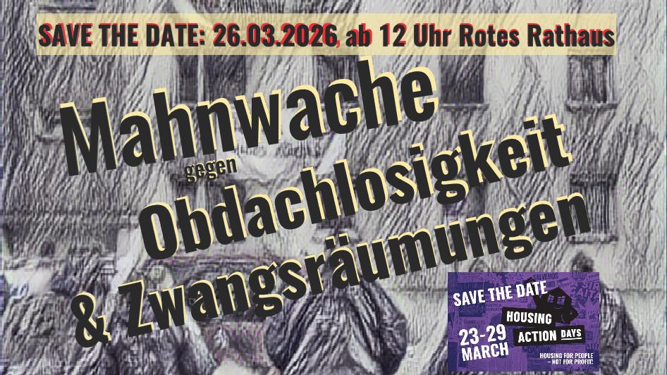 - Donnerstag, 26. März, ab 12 Uhr bis abends: „8. Mahnwache gegen Obdachlosigkeit und Zwangsräumung“ mit einem reichhaltigen Bühnenprogramm vor dem Roten Rathaus, die bis Freitag andauert