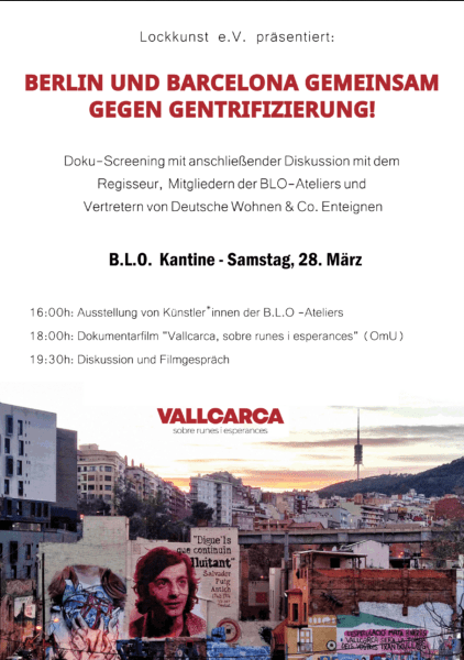 - Samstag 28. März, ab 16 Uhr: B.L.O. Ateliers (Kaskelstr. 55), Ausstellung mehrerer Künstler:innen, die in den B.L.O. Ateliers tätig sind, Dokumentarfilm „Sobre runes i esperances” mit Diskussion.