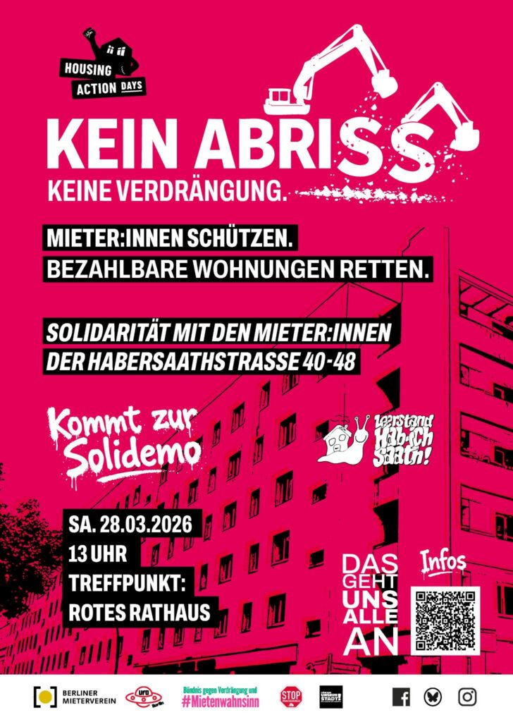 - Samstag, 28. März, um 13 Uhr: vor dem Roten Rathaus, „Rekommunalisierung Jetzt! Soli-Demo für die Habersaathstraße 40-48 – Kein Abriss, keine Verdrängung!“, gemeinsam mit dem BMV.