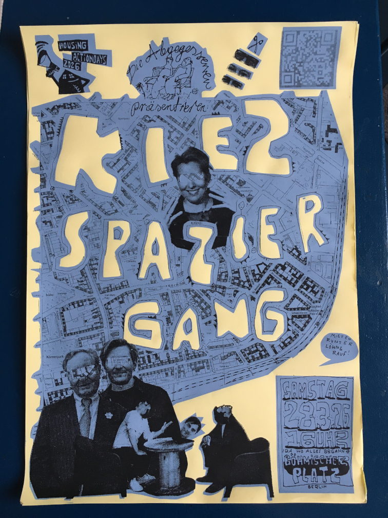 - Samstag, 28. März um 16 Uhr: laden die Abgegessenen zum „Kiezspaziergang gegen Aufwertung und Verdrängung in Rixdorf“ auf den Böhmischen Platz, Neukölln.