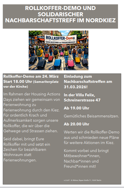 - Dienstag, 24. März um 18 Uhr: „Rollkoffer-Demo im Nordkiez“ an der Samariterkirche, Samariterstr. Ecke Bänschstr., Friedrichshain